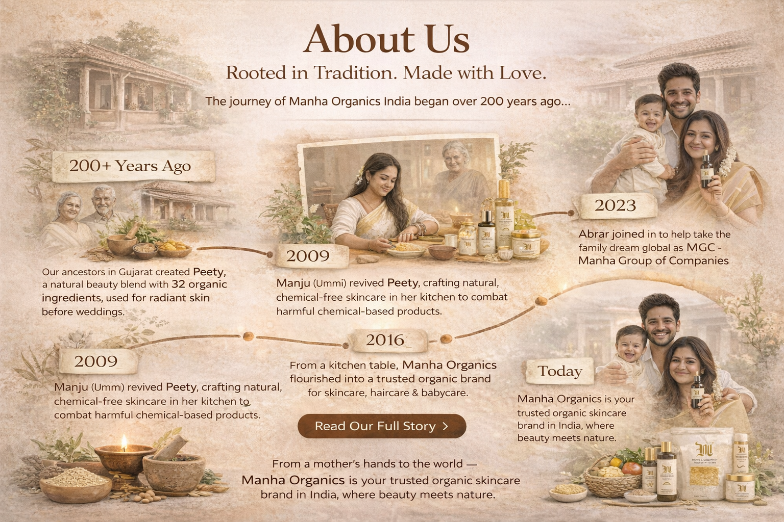 Welcome to Manha Organics, where the secrets of timeless beauty meet the legacy of tradition. Rooted in the rich history of the Cutchi community, our journey began in 2009 with a vision: to bring the power of nature's purest ingredients to people everywhere. Inspired by our family's heritage and the ancient wisdom passed down through generations, we craft natural skincare and organic hair care solutions that nurture, rejuvenate, and restore your skin and hair, just as nature intended.